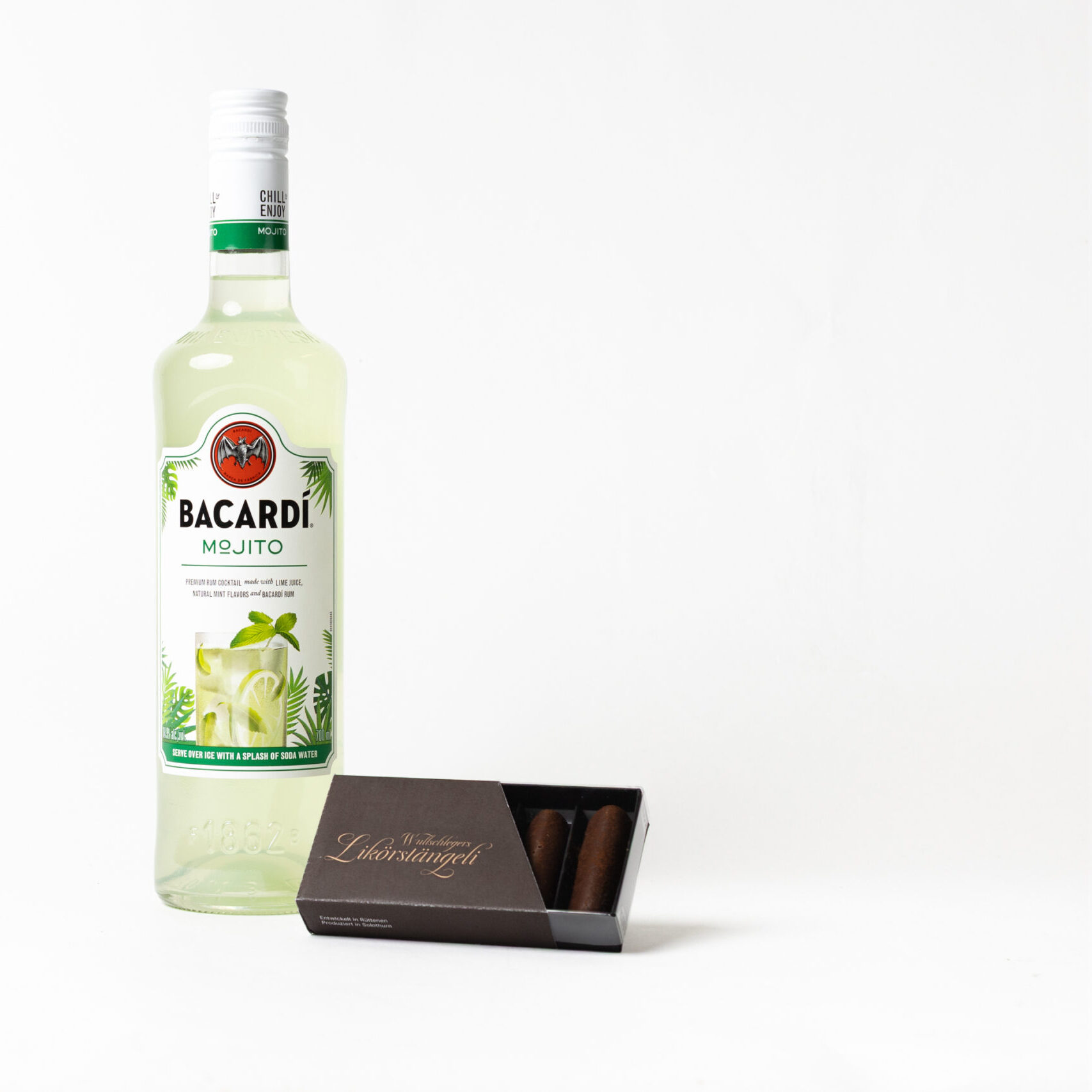 Likörstängeli mit Bacardi Mojito, eine geschmacksvolle Spirituose aus Limetten, Rum und Minze. Eine Kombination aus Spirituosen und Schokolade höchster Qualität.  Knackige Schokolade mit einer feinen Zuckerkruste und einem flüssigen Kern sorgen für einen optimalen Genussmoment. Alle Likörstängeli sind handgemacht in Solothurn.