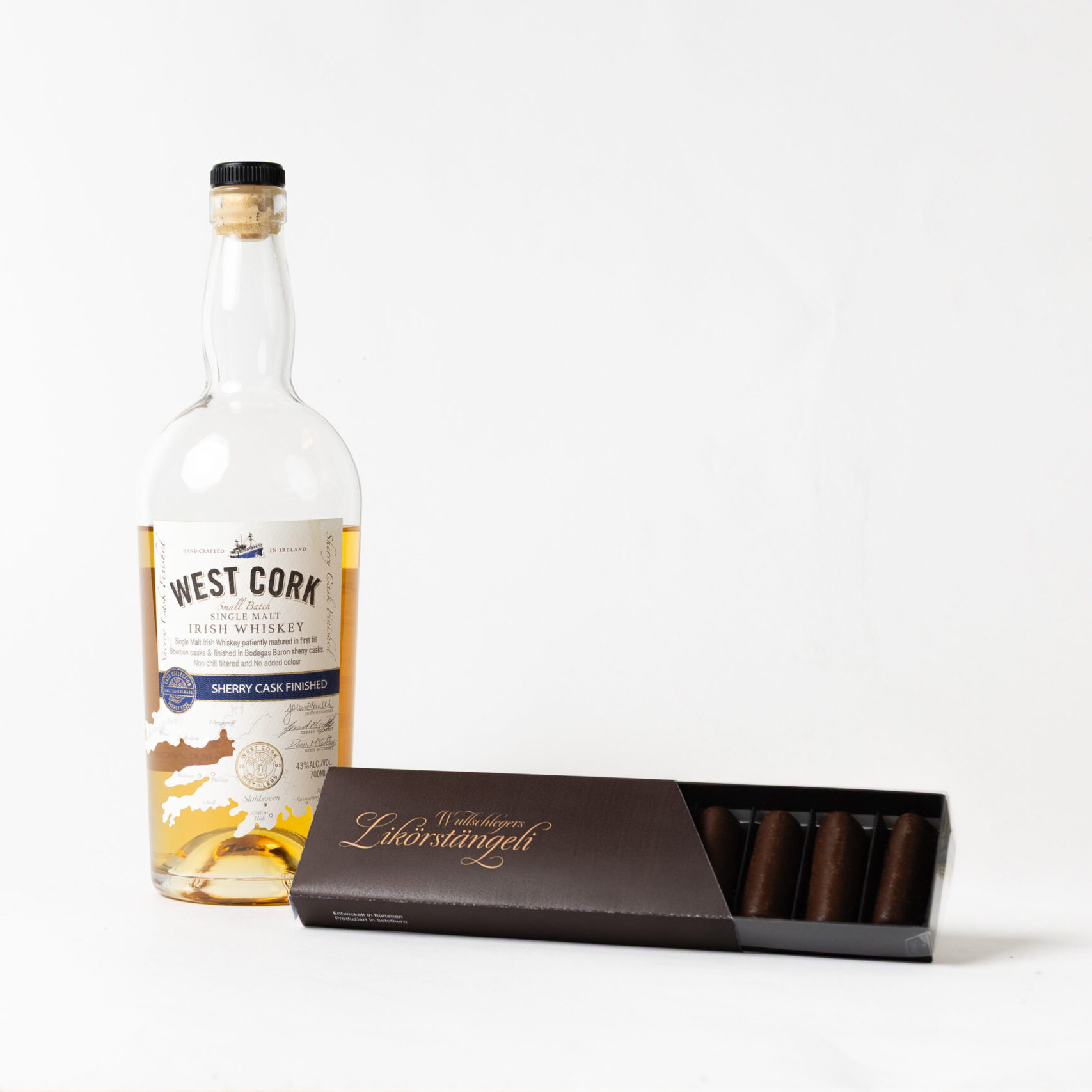 Zucker, Wasser, Couverture Dunkel (Zucker, Kakaomasse, Kakaobutter, Emulgator: Sojalecithin (E322), Aromen: Vanillin), West Cork single Malt Irish Whiskey, Weizenstärke, Maisstärke, Kann Spuren von Milch, Hartschalenobst, Sesam, Sulfiten und Erdnüssen enthalten. Enthält Alkohol.